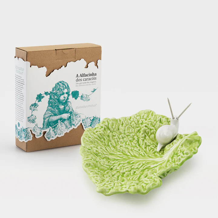Esta folha de alface foi especialmente pensada para servir caracóis ou outros petiscos. A peça permite a lavagem na máquina de lavar e o uso do microondas. A caixa é feita em cartão microcanelado e envolvida por uma cinta de papel, que contém uma ilustração e o resumo do conto “A Alfacinha dos Caracóis”, que conta a história da origem do termo “Alfacinhas” para se referir aos habitantes de Lisboa, bem como a de uma jovem vendedora de alfaces de cabelo encaracolado que um dia salvou a cidade de Lisboa de um cerco. Traduzido para Português e Inglês.